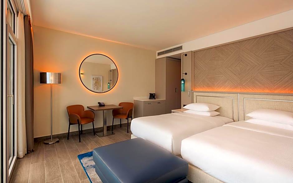This modern twin bed room features stylish décor and plenty of natural daylight. Admire views of the sea from the private balcony of this guest room and unwind and watch the 55-inch HDTV and stay connected with complimentary WiFi. Additional amenities include a mini fridge, tea/coffee making facilities, a laptop safe and air conditioning.