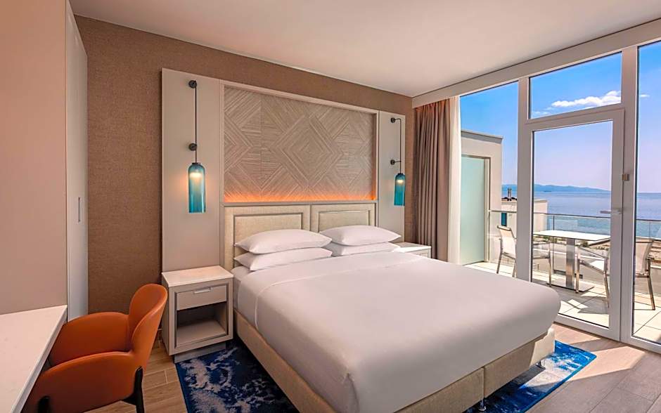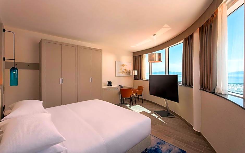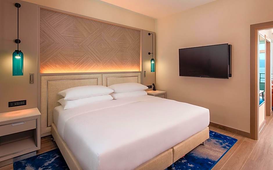 This deluxe room with one king-sized bed is located on the higher floors of the resort. The room features modern décor and a private balcony with a view.