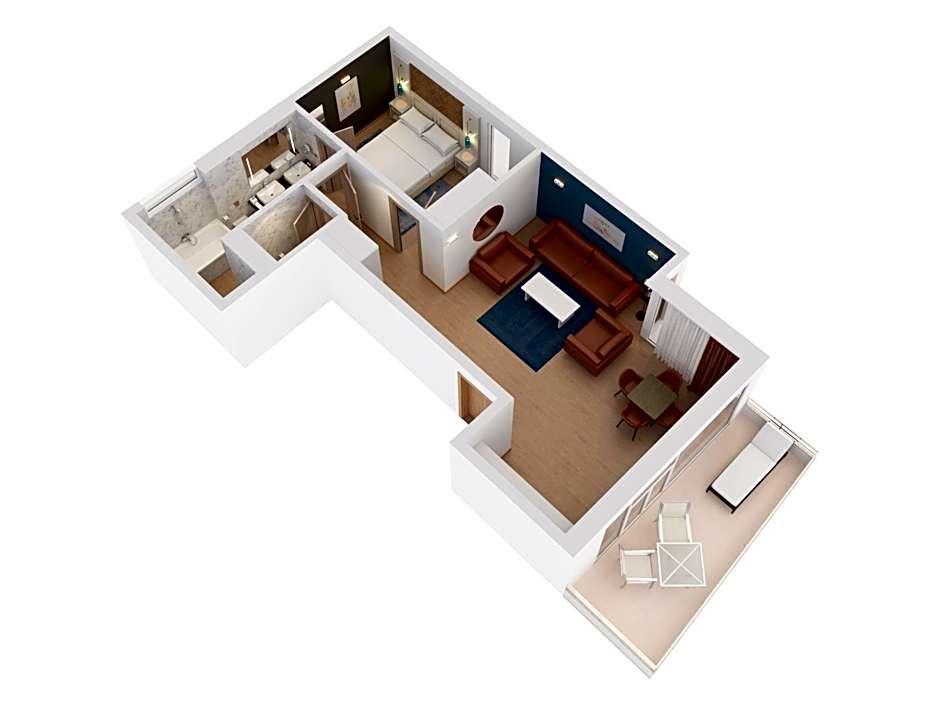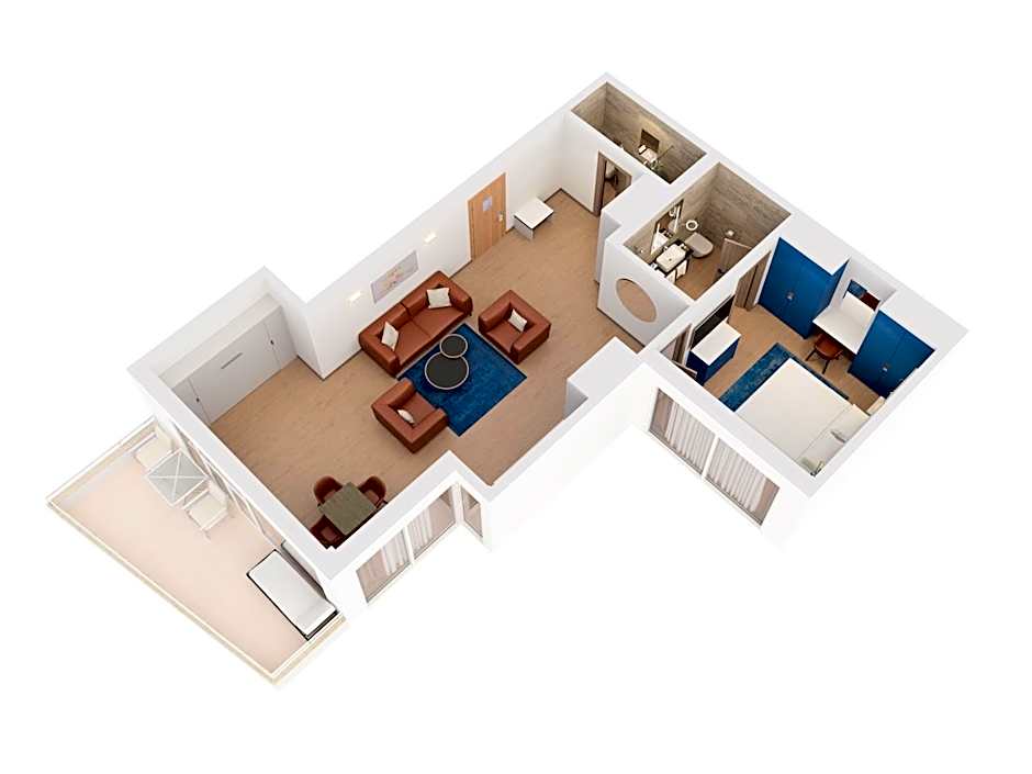 This suite features contemporary amenities and a furnished balcony with a sea view. There is a unique semi-circular living room with seating area. Two HDTV’s and complimentary WiFi ensure you stay connected.