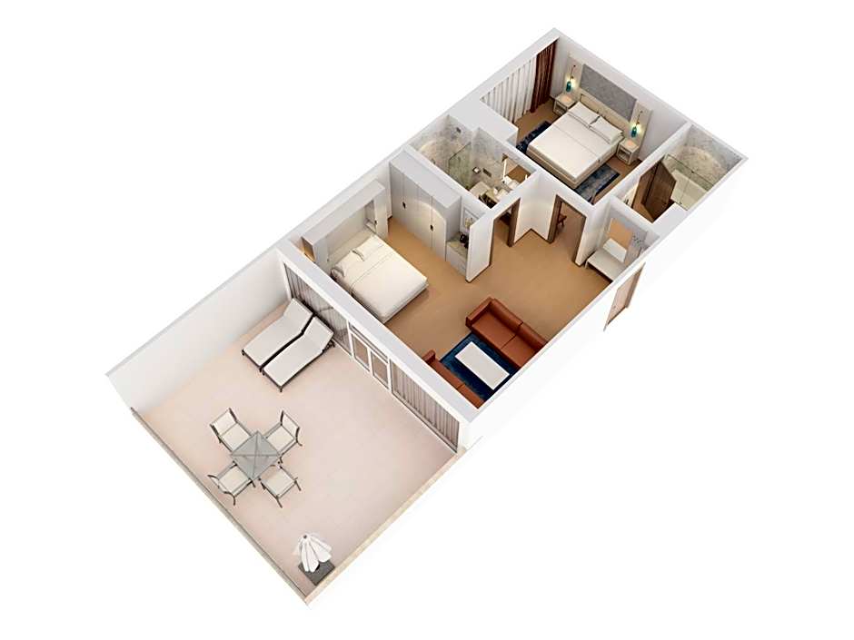 This two-bedroom suite is located in one of the resort’s unique villa buildings. With two private balconies overlooking the sea, this suite features a living room with a dining table, a master bedroom with one king bed and an private bathroom while the second room features another two twin beds and its own bathroom with a shower.